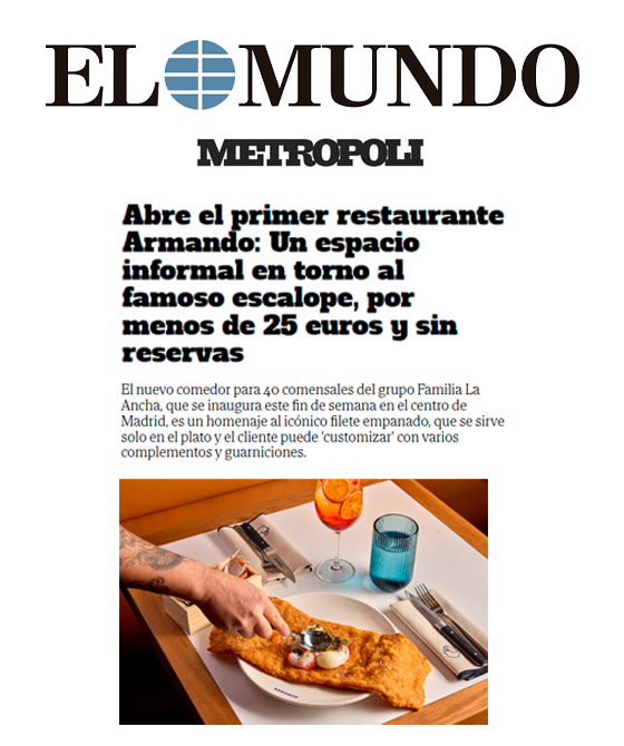 Diez años después, el momento ha llegado: “Abre el primer restaurante Armando: Un espacio informal en torno al famoso escalope, por menos de 25 euros y sin reservas”, afirma María Canales, redactora de Metrópoli. Para ella, “tenía todo el sentido del mundo que el escalope más famoso de España encontrara su templo, un espacio propio donde tener todo el protagonismo y donde poder ir a disfrutarlo”. Y visto con sus palabras, reiteramos: tenía todo el sentido del mundo. Abríamos a inicios de diciembre, con un comedor para unos 40 comensales donde servir el escalope Armando en mesa vestida, por elevar la experiencia, pero también por pura necesidad, porque este escalope no viene solo, llega a la mesa con un despliegue de sabores y el trabajo impecable del personal de sala que arma, literalmente, el Armando en mesa.